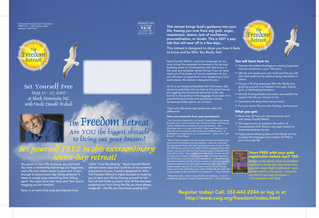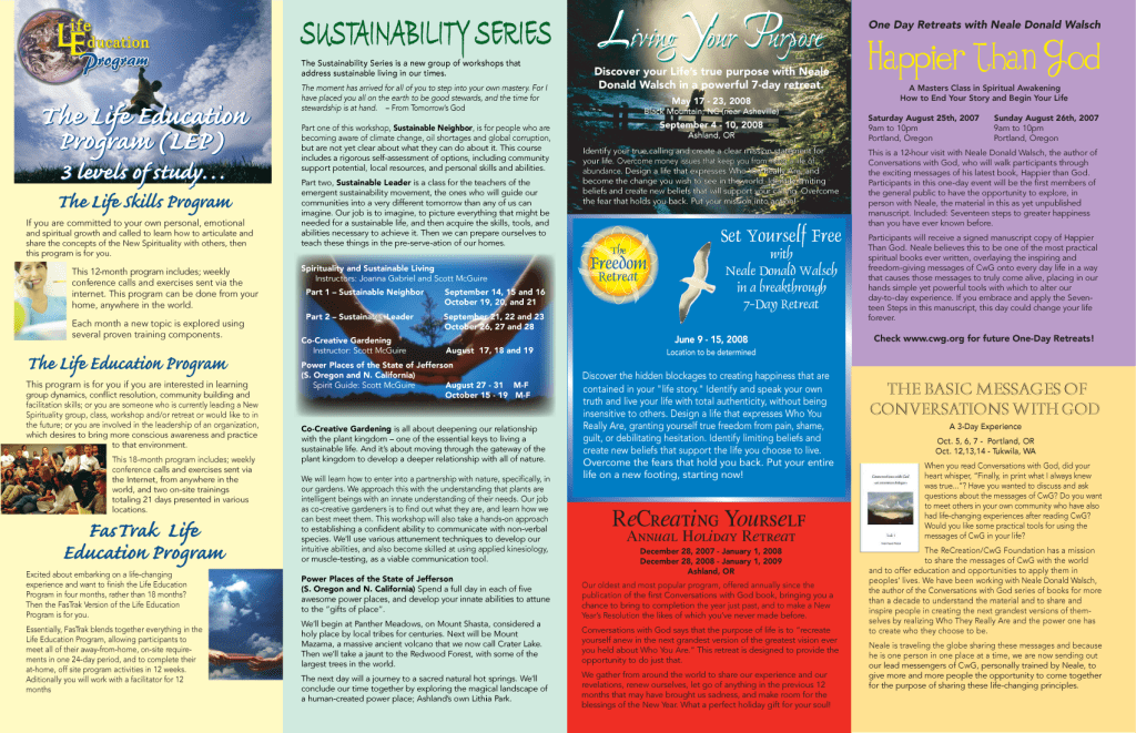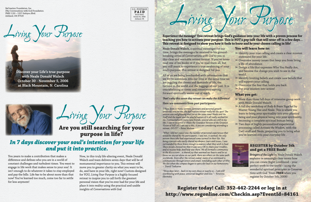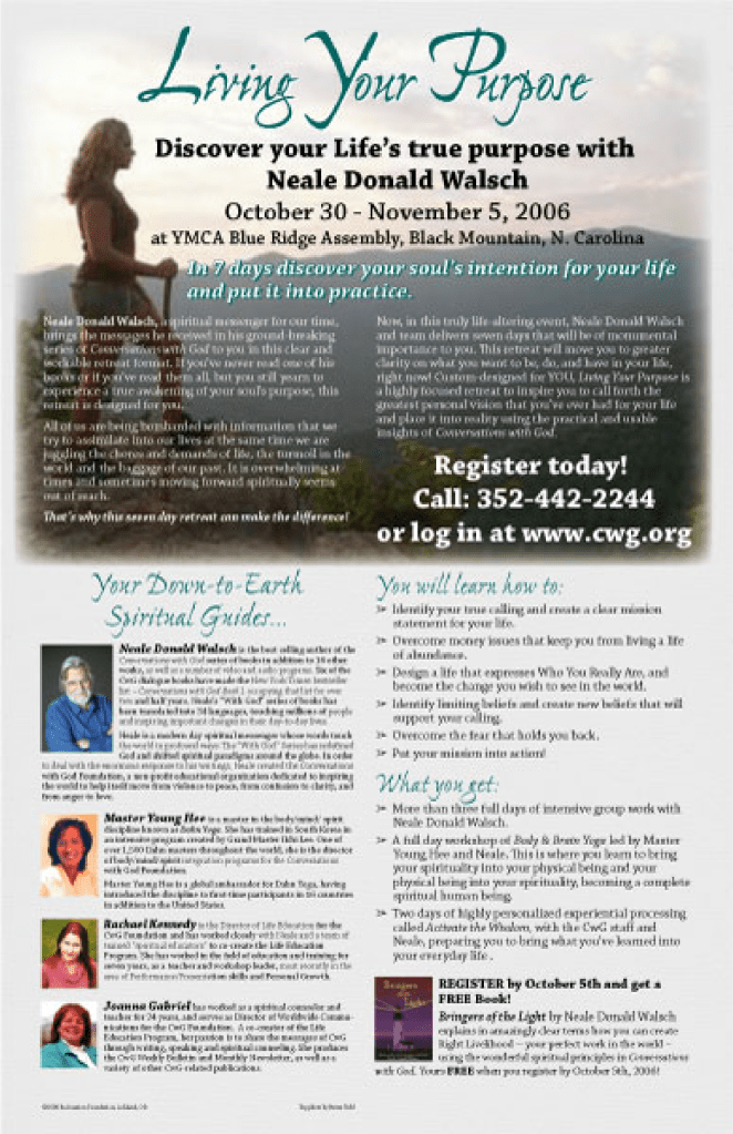 Best selling author Neale Donald Walsch has offered seminars for many years. For a while, the attendance had dwindled down so I was hired to develop a plan to improve the attendance. The plan I created included direct mail, email blasts, web pages, posters and robo calls.There were a lot of moving parts, volunteers and outreach working with a team spread out nationally. The first seminar improved attendance by 616%. Subsequent seminars continued to improve in size and profitability.